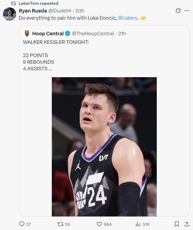 湖人记者Ryan Rueda看到凯斯勒的表现后转发了凯斯勒的数据并@湖人官方:要尽一切努力让凯斯勒来湖人搭档卢卡-东契奇。